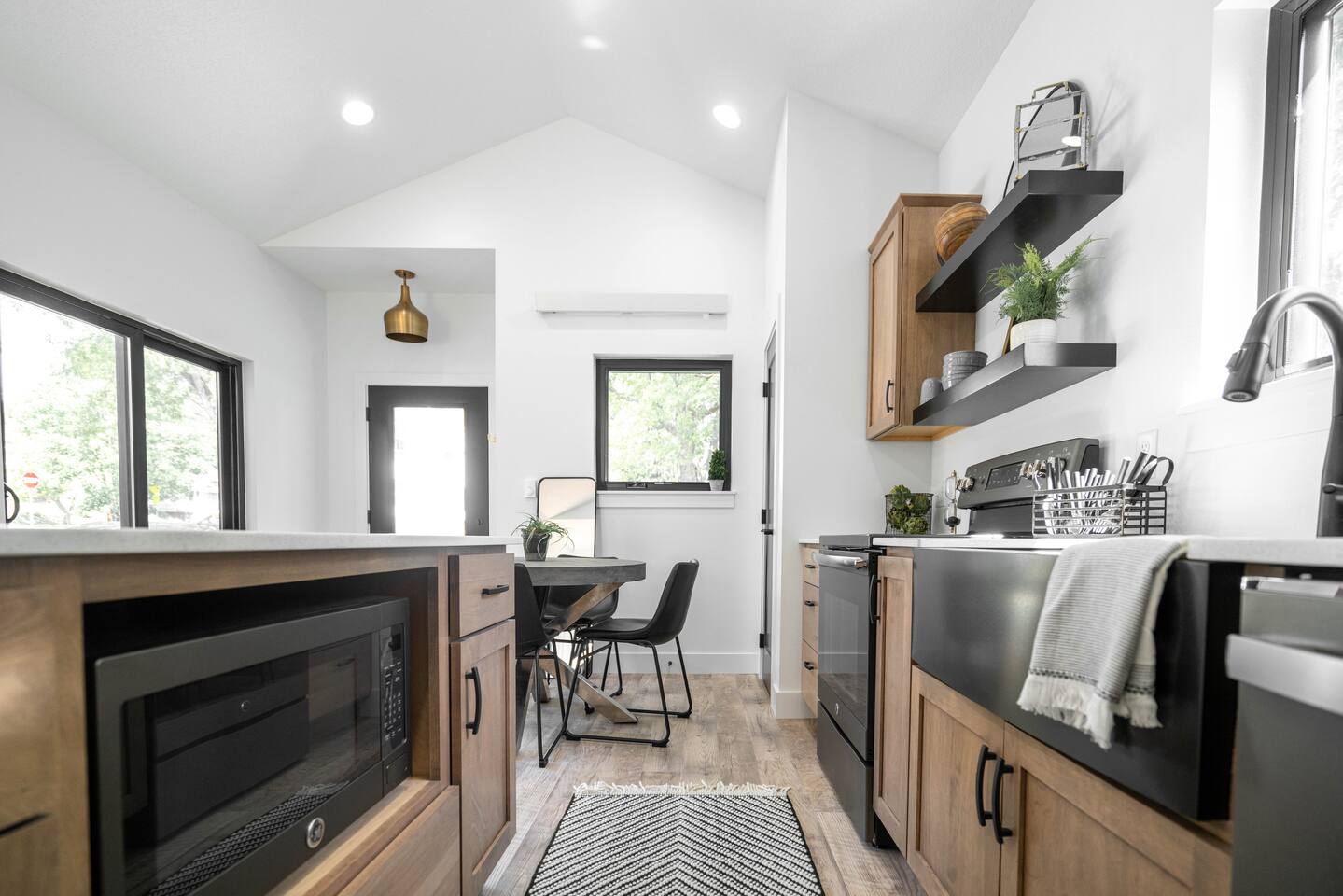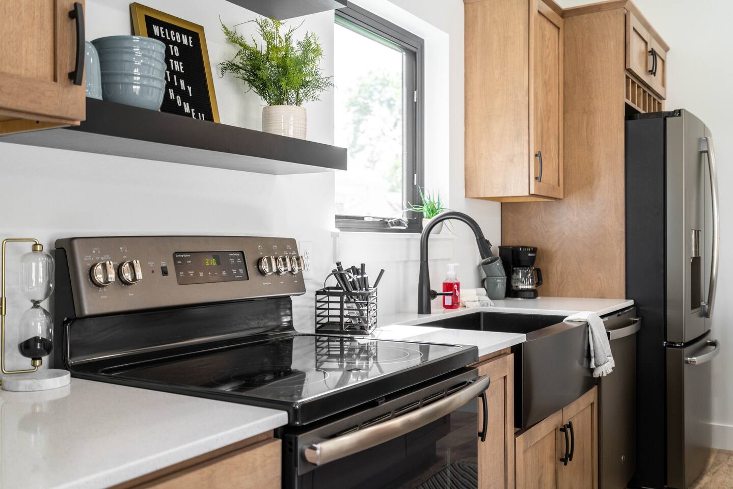 Filtered water is available from the refrigerator. The house is 100% electric. Fire extinguisher is under the sink.